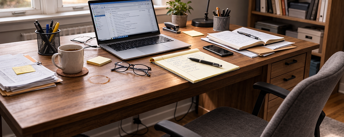 Home office desk with laptop, notes, and coffee—quiet workspace for reflection and spiritual discernment about inner voices.