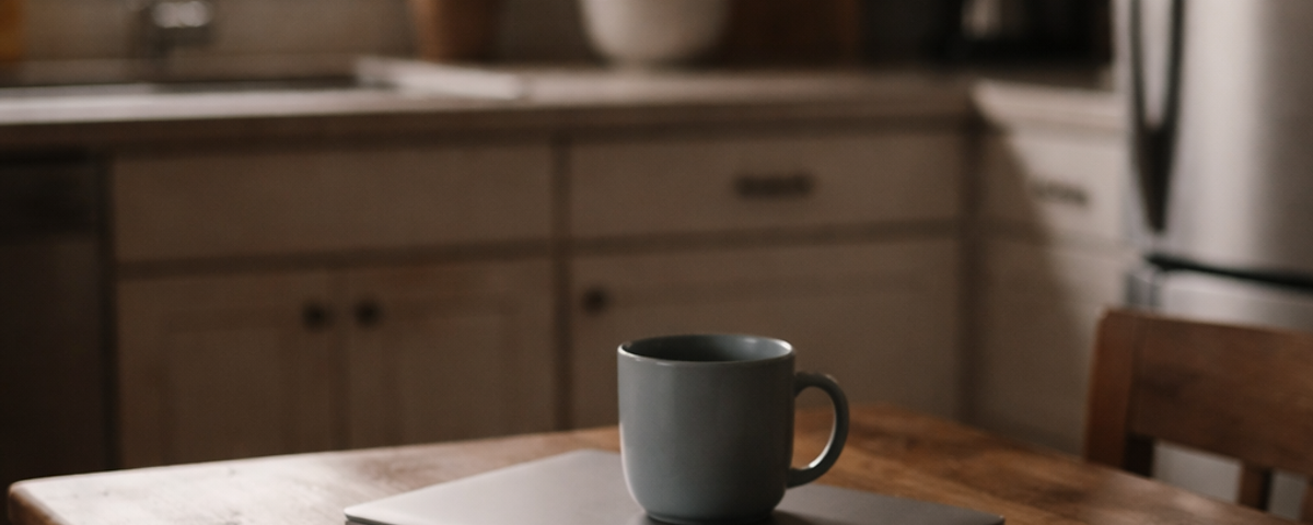Quiet morning kitchen with a coffee mug resting on a closed laptop on a wooden table, soft natural light entering the room