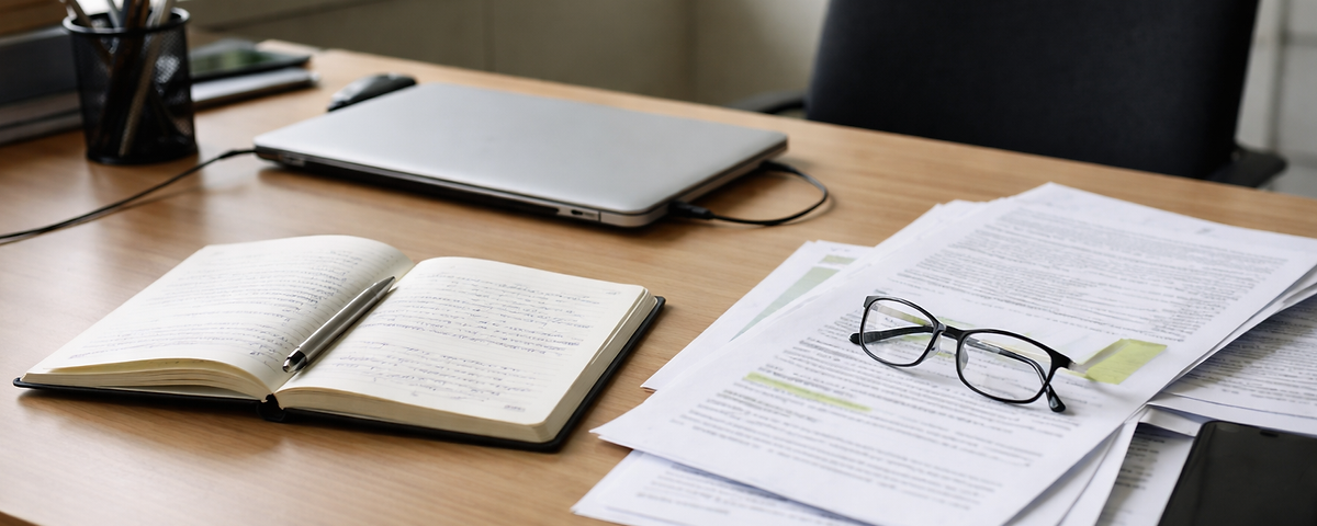 Workspace with open journal, annotated documents, laptop, and glasses representing spiritual discernment, interior authority, and integration work for high-responsibility leaders questioning spiritual submission and institutional faith.