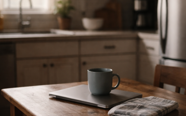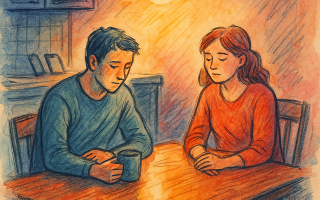 You’re together, and somehow lonely. The kitchen is dim and kind. Two phones sleep by the sink. The dishwasher hums, steady and impersonal. You trade updates: soccer pickup, a budget…